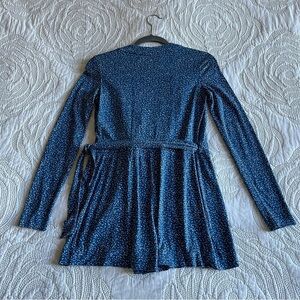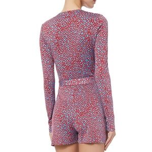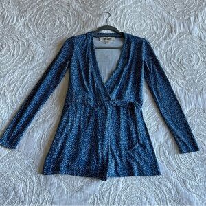 Keywords: DVF Celeste romper, Wrap-style romper, Blue and white romper, Banded wrap romper, Trendy wrap romper, Luxury romper, Chic summer outfit, Iconic DVF pattern