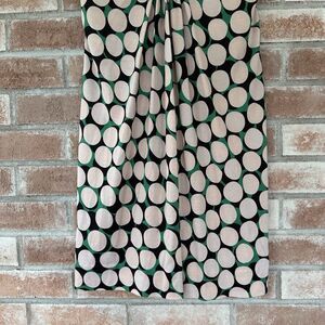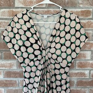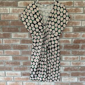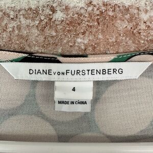 Women's size 4 Diane Von Furstenberg Natalie dress. Shift style with a gathered v neck. 100% silk material. Green and peach geometric circular pattern. Excellent condition!