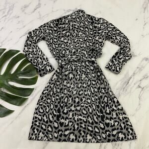 Diane Von Furstenberg women's gray and black leopard print silk wrap dress, size 2. It is free from any rips or stains. It measures about 38 inches around the bust, about 28 inches around the waist and is about 34 inches long.