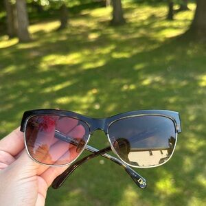 Stylish sunglasses with a sleek black frame. Vibrant pink interior adds a pop of color. Perfect for a chic look.