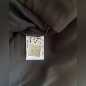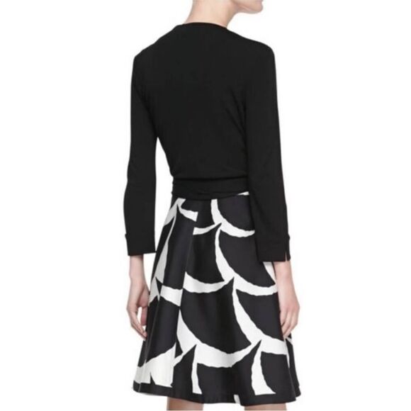 wrap dress with print on the skirt in black and white and the top is solid black, new dress with tags