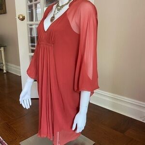Diane von Furstenberg fleurette silk chiffon dress in rust. This beautiful dress is light weight and ‘flowy’ with sheer Dolman sleeves. There is a built-in lining. In very good preowned condition with no holes or pulls in the fabric.