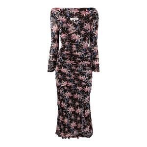 Ganesa off-shoulder ruched dress from DVF Diane von Furstenberg featuring black/multicolour, all-over floral print, ruched detailing, draped detailing, off-shoulder, long sleeves, mid-length and front slit.