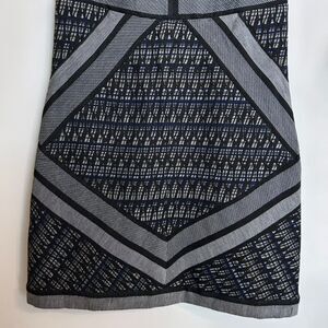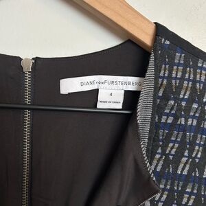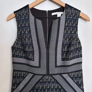 Details: Purchased from Nordstrom and worn less than 5 times. Beautiful DVF quality. Fully lined. This sleeveless graphic sheath dress has a metallic thread woven throughout the striped design, features a split neck, exposed back zipper & fully lined bust