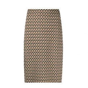 DVF Knit Geometric Pencil Skirt. Hidden rear zipper. Stretch. Unlined. Rear kick pleat. Brown, black, cream.