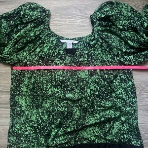 Diane Von Furstenberg top. Scoop neck. Green and black print with black trim. 100% silk. Keyhole front. Bubble sleeves. Size S. Previously owned.