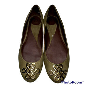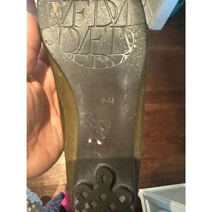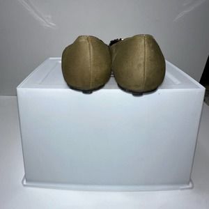 Features: Classy Dian Von Furstenberg DVF suede ballerina flats in green with gold metal decal logo. Sold green, olive green, slip-on shoes. Great for work or play. Rounded toe and lightly padded.