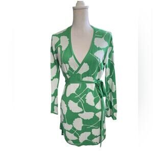This elegant bodycon dress by Diane Von Furstenberg features a striking green and white color palette, perfect for a night out or cocktail event. The wrap design with a plunging neckline and long sleeves offers a sophisticated silhouette that hugs the body beautifully. Crafted for style and comfort, this dress is a standout choice for any special occasion.