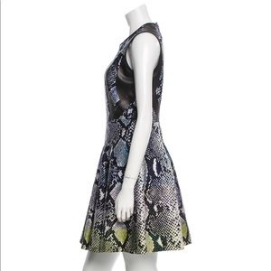 Black, green, and blue Diane von Furstenberg snake print dress with leather accents, crew neck, pleats at bottom, flare hem at skirt, tonal stitching and concealed zip closure at back.