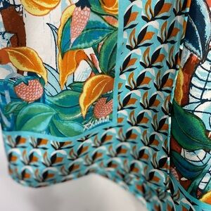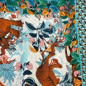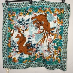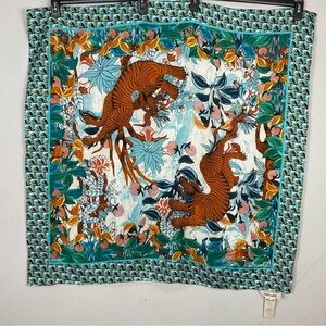 Made of 100% silk, featuring a tiger and floral print. Can be styled in various ways, such as around the neck, as a headscarf, or tied to a bag.