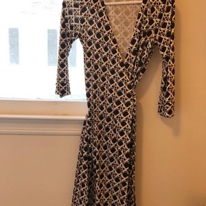 Silk Jersey Wrap Dress with Dark Brown and White Print. Perfect Condition. 3/4 Sleeve. Size 4.
