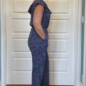 Off shoulder jumpsuit with elastic waist and pockets. Comfortable super soft silky fabric. (Care and fabric tags were not attached) Dry Clean only. Size 4 but tag says "P". It is not petite.