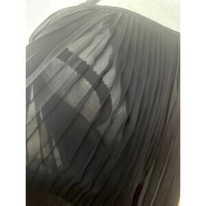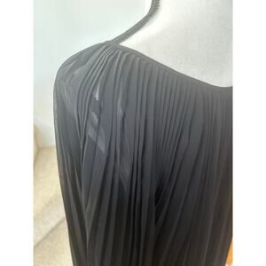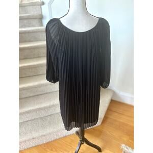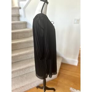 Very good condition, Minor run in one sleeve that gets buried in the pleats (you won't see it). Black pleats, balloon puffed long sleeves, scoop neck with tie. Hits mid thigh. Loose and flowy.
