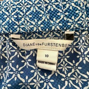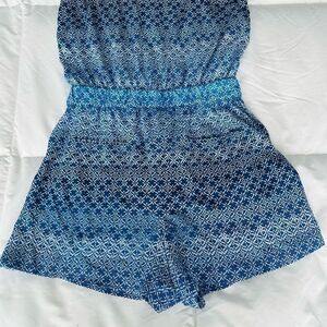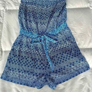 Step out in style in this blue & white, silk and strapless romper by designer Diane Von Furstenberg. Elastic around strapless top with a figure flattering tie waist. L 25” x inseam 2 1/2” x W 32” across stretchy top. In excellent condition.