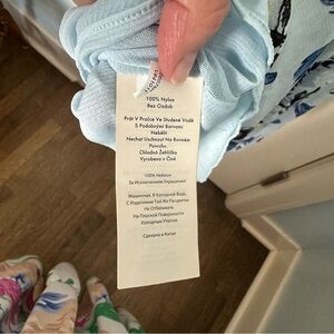 Elegant floral maxi dress with a blue and yellow pattern. Features a V-neck and short sleeves. Nylon with bodice and skirt lined. Sleeves are sheer flutter sleeves. Pastel blue with dark blue, yellow, black and white floral pattern. Smocked waist with elastic and a lot of stretch.