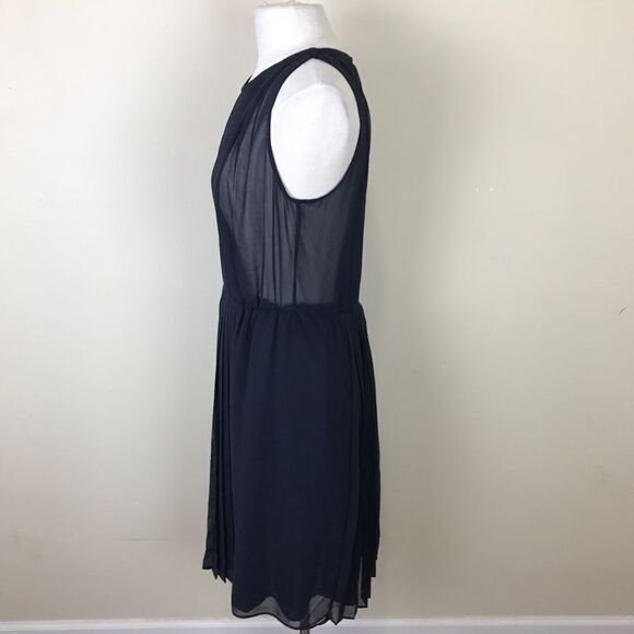 Gorgeous Navy Pleated silk dress, has lining, zip entry, mini length. No flaws. Easily can be dressed up or down. Scoop neck, sleeveless style. Missing matching waist tie.