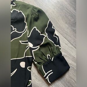 Diane Von Furstenberg Olive Green & Black Floral Print Silk Blouse size 6