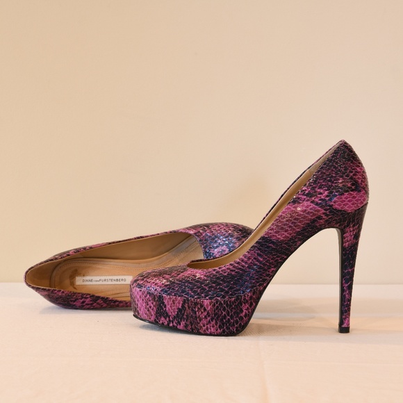 GORGEOUS purple/black snakeskin pump with concealed platform from designer Diane Von Furstenberg. Cushioned insole. Beautiful, fun, and comfortable.