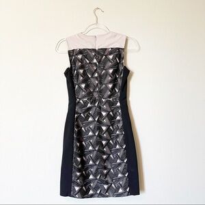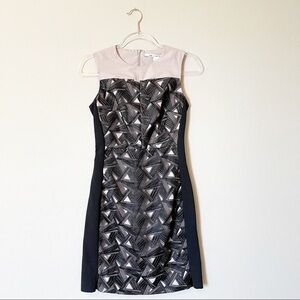 Diane Von Furstenberg 'Reona' sheath dress. Embroidered cut-out overlay, zipper slits in the front bottom of skirt. Excellent condition.