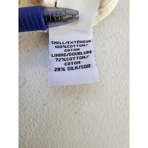 Shell material: 100% cotton; Lining material: 72% cotton, 28% silk (per tag).