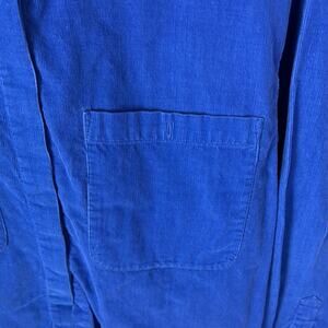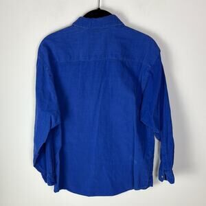 Gently Used Diane Von Furstenberg Retro Button Down Shirt. This is a women's large. Blue throughout. Two front pockets. Thin vertical ribbing. 100% cotton. Made in Maldives.