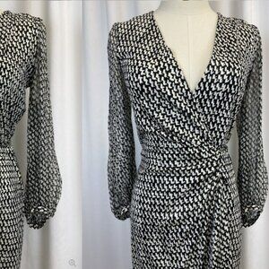 Eternally classic and chic Diane Von Furstenberg wrap dress in a chic black and white houndstooth style print. 100% silk feels like heaven. Lined body. Semi sheer sleeves. Matching belt. Size 4. Approximately 16”-17” bust (wrap gives you some wiggle room) and 36” length. Excellent condition.