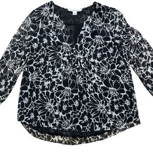 Diane Von Furstenberg Silk Blouse Sz 6 Black White Floral 3/4 Sleeve Sheer Top