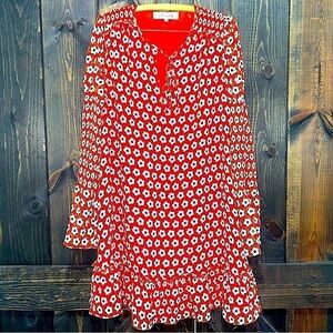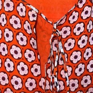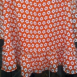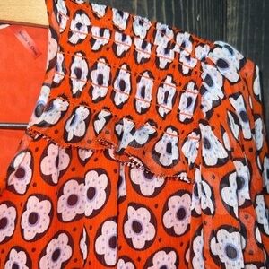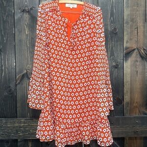 DVF silk dress. Size small. Redish orange color. Desert Poppy print. Chiffon. Smocked details. Long sleeves. Retro look. Lined. 60’s / 70’s style. Tie front neckline. Flare / bell sleeves. Hippie vibes. Beautiful bohemian & feminine ruffle accents. Flowy. Floral. Dress up or down. Preloved. Please see all photos for condition.