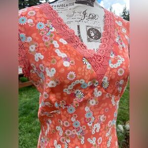 Embrace elegance with this stunning floral dress featuring delicate lace trim. Perfect for any occasion, this orange dress adds a vibrant touch to your wardrobe. 100% silk bias cut so that it stretches over. No zippers. Sz small will fit up to a 38” bust.