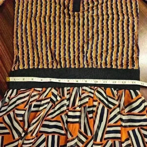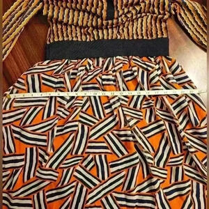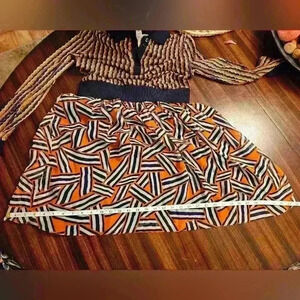 Unique silk dress from Diane Von Furstenberg in excellent used condition. Features a silk knit polo button top with long sleeves in a vibrant geometric navy, orange, cream and beige print. Elastic drop waist with a silk pleated full skirt in the same colorway but a different geometric pattern. Skirt is fully lined in navy polyester fabric. Size 4. Dry clean only.