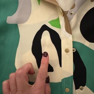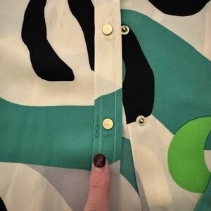Beautiful 100% Silk Blouse from DVF. Multicolored Mod Print with Snap down center front. Small marks (see photos) but they should come out at the cleaners