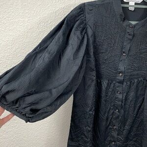 Textured 100% silk blouse with gorgeous feminine details. Puff blouson sleeves, button front, babydoll fit.