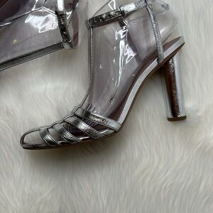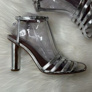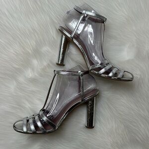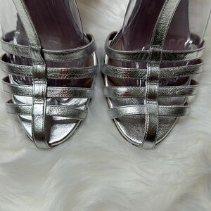 Diane Von Furstenberg silver metallic sandals. T straps. 4” heels. Adjustable strap. Womens size 9.5. Once worn twice. Great used condition.