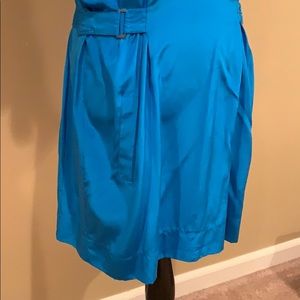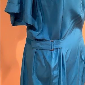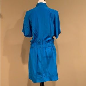 Small stain probably can be taken out by dry cleaner. Super pretty blue with pockets in front and Velcro side detail and snaps in front