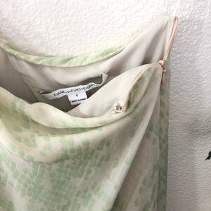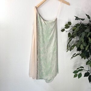 A stunning 1 shoulder dress made with pastel pink and green with a dark grey small accent. A simple snake skin pattern to pull it all together. Side zipper