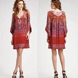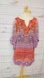 Stylish bohemian dress with vibrant red, orange and purple patterns. Perfect for a chic look.