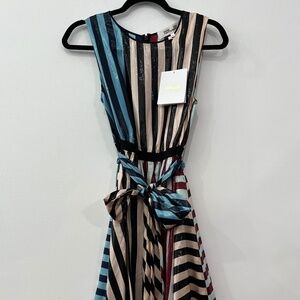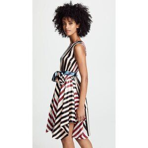 This easy, sleeveless dress is the perfect summer piece. Cut in a metallic silk mix, it is printed in our Carrington Stripe in pacific/black. It has a mid-length silhouette that falls to the knee with an asymmetric hem, and a waist tie in the same printed fabric. Perfect for a breezy summer day.
