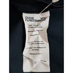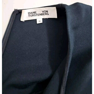 Elevate your wardrobe with this stunning black midi dress from Diane Von Furstenberg. Perfect for formal occasions, workwear, or business events, this dress features a scoop neckline and zip closure. The dress is made of a comfortable jersey fabric with a wool blend and is unlined, making it perfect for summer, fall, or spring.