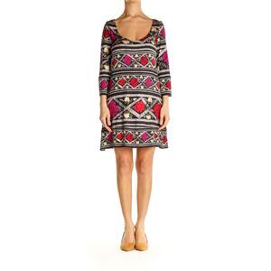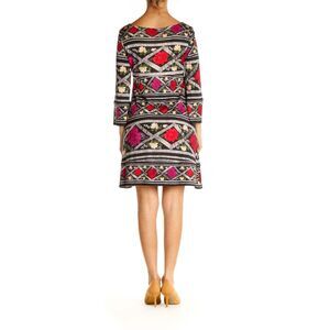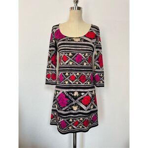 Scoop-neck, tent dress, 3/4 length bell sleeves, empire seaming aross the bust, Matador Cape Band print, 100% silk jersey. Approximate measurements are chest 17” flat pit to pit, 26” from bottom of neckline to hem on center front, 31” on center back. Sleeve length 17.” Excellent preowned condition.