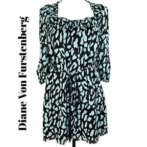 Embrace your wild side with this Diane Von Furstenberg mini dress in black and green animal print. The square neckline and 3/4 sleeves add a touch of elegance to this playful dress, making it perfect for any occasion, whether it's a party, casual outing, or travel adventure. The dress is made of a blend of viscose and polyester, making it comfortable to wear and easy to care for. The dress length is short, making it perfect for showing off your legs.