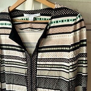 Diane von Furstenberg | Women’s black, cream multi geometric pattern silk jersey shirt dress. 3/4 slit sleeves, v-neck, vertical stripe. Care tag removed. Women’s size 10