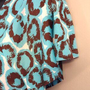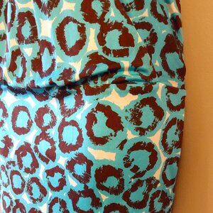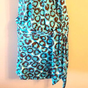 *REASONABLE OFFERS ACCEPTED* Size 4. Bust 33" - Waist 31" - Hips 33" - Back length 35.5". Made of 70% Silk and 30% Nylon. Colors are brown, aqua and white. Wrap dress bodice. Tight fitting mini bottom with tie at waist. Snap closure at v-neck. Stretchy. Dry clean only. Gentle wear.