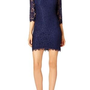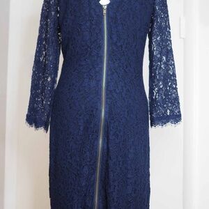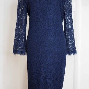 Gorgeous, elegant and in absolutely perfect condition. Deep Navy Blue lace. I don't have tags and can't say it's new technically but it's never been worn out of the house! I purchased two sizes and this one was slightly too big for me. For reference, I am athletic build with no hips but generous rear, 5'4" 128lbs 34B. The 6 I'm keeping fit me almost like a body con but in a classy way. The 8 didn't show any curves on me like the model pics. So if you have hips and are gifted with a few more lbs and C to D cup, this 8 should fit like the model pics. Hope this info helps!