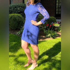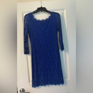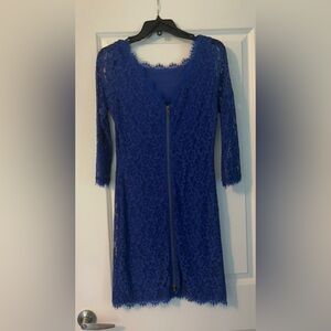 Diane Von Furstenberg Zarita Lace Dress. Back brass’s zipper. Excellent condition. Pictures reflect lace trimming detail on neckline & bottom of dress. Back has a vneck detail. Inner attached lining throughout entire but the sleeves. Arms are sheer to reflect lace.