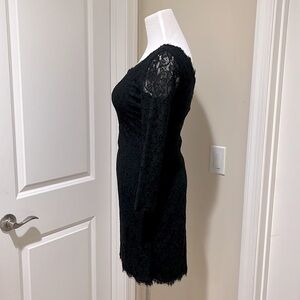 Diane Von Furstenberg Dress- Zarita Style - Sheath - Mini Length - 3/4 Sleeves - Round Neck - Deep V-Back Points to an Exposed Full-Length Zipper with Unexpected Edge - Scalloped Eyelash Fringe Traces Every Edge of an Allover-Lace Dress - Fully Lined Except for Sleeves - Size 2 - Shell: 70% Rayon & 30% Nylon - Lining: 88% Viscose & 12% Silk - No Flaws - Excellent Used Condition!