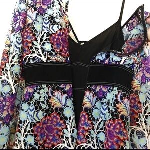 New with tags! Stunning long-sleeve multicolor luxe guipure lace dress by Diane Von Furstenberg (DVF Official - not a diffusion line). Canton floral print embroidery & honeycomb lace over delicate sheer black mesh. Black piping at V-neckline & cuffs. Black waistband w/white top stitching. Black mini length slip attached - lower portion of dress is sheer (*note* threads/snaps to attach slip straps to lace shell at inner shoulders need to be repaired - does not impact functionality of dress & does not show when dress is on!) Hidden zipper at back. Minor flaw to honeycomb lace at bottom/back. Women’s size 4. Please see all photos as part of description. Smoke-free home!