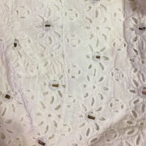 White DVF shorts with eyelet pattern, tie at the waist, rolled at the bottom. Pockets in front and pockets on back with flaps.