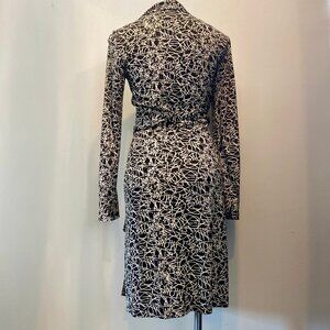 Diane Von Furstenberg size 6 silk wrap dress with tie, brown and white, midi length, long sleeve.