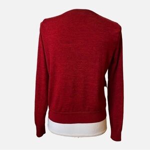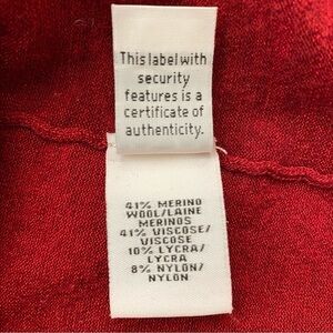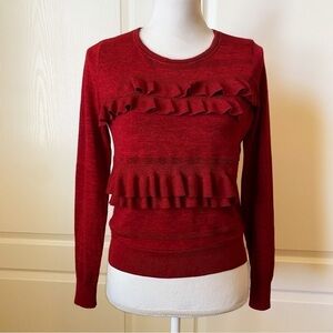 Diane Von Furstenburg DVF Benni Sweater with ribbing and asymmetrical stripes across the front bring a dainty feminine feel to this finely knit sweater. Crew neckline and long sleeves. Perfect color for the holidays. In very good preloved condition.