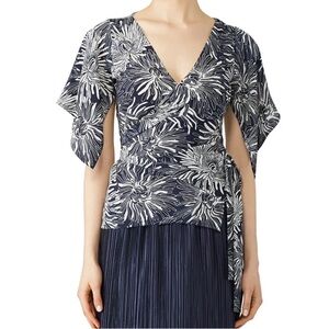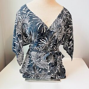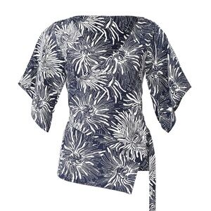 Diane Von Furstenburg 100% navy side tie wrap top with lovely white floral motif. This is a beautiful silk blouse with butterfly sleeves and true wrap ties. V-neck, asymmetrical hemline. Adjustable waist because of the tie.